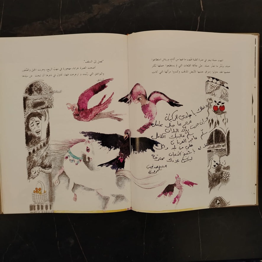 Description: A two-in-one biographical book by Lebanese writer and artist Najah Taher. al-Hajr recounts her Lebanese life with photos and illustrations from the Amal Mountains, while Matahat al-'Askafi focuses on Egyptian avant-garde poet Abdel Mun‘im Ramadan (b. 1951).